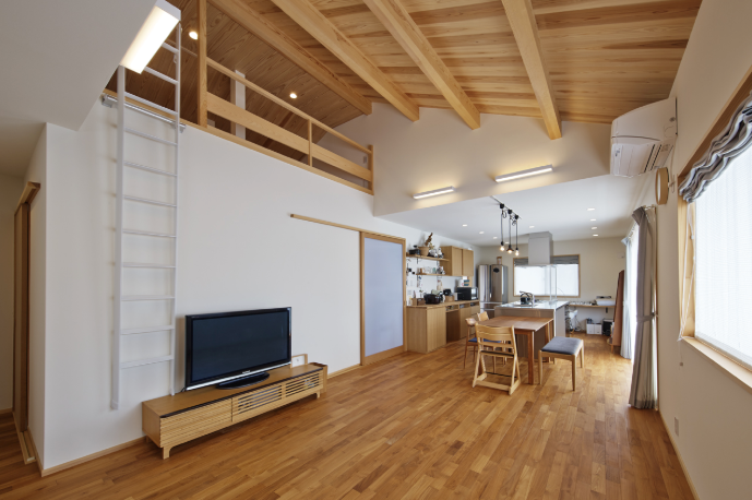 二世帯住宅ならではの家事動線を考えて、玄関は8帖ほどある広々空間とし、大容量のシューズクローゼットを造り付けて二世帯が快適に使えるようにしています。また、子世帯が暮らす2階のリビングは、勾配天井を生かした開放的な空間に。キッチン〜洗濯室〜収納空間〜洗濯を干すサンルームをグルグル回遊できるよう動線をプランニング。家事の負担を設計で軽減しています。2階リビングの床材には無垢のチーク材を使用するなど、場所ごとに無垢材を有効に使っています。